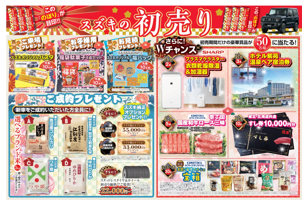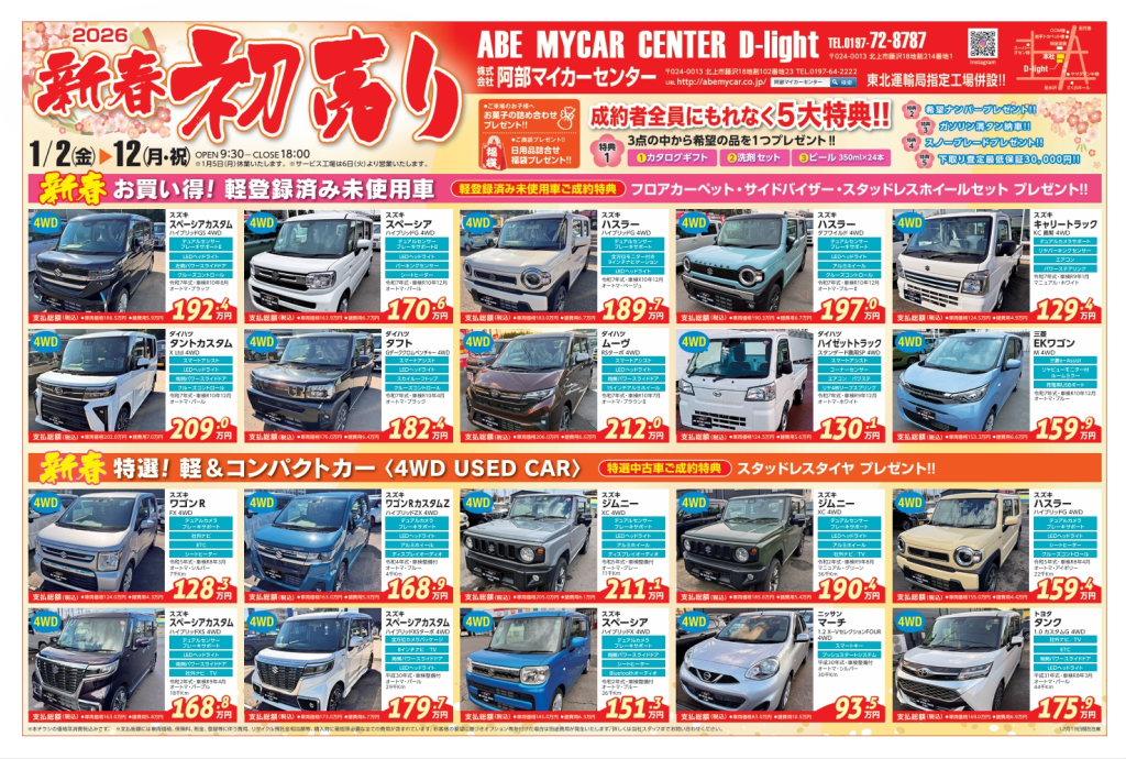 2026年のスタートに合わせ、阿部マイカーセンターD-lightでは新春初売りを開催いたします。